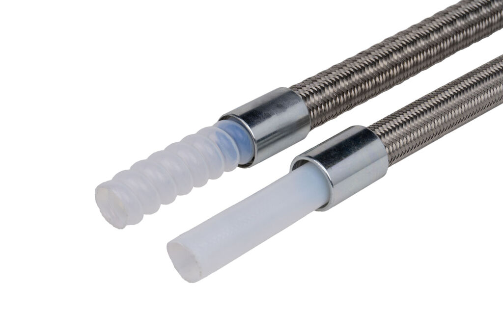 Wąż teflonowy z oplotem stalowym łączy przez to zdecydowane zalety wynikające z właściwości PTFE z wytrzymałością dorównującą wężom hydraulicznym.